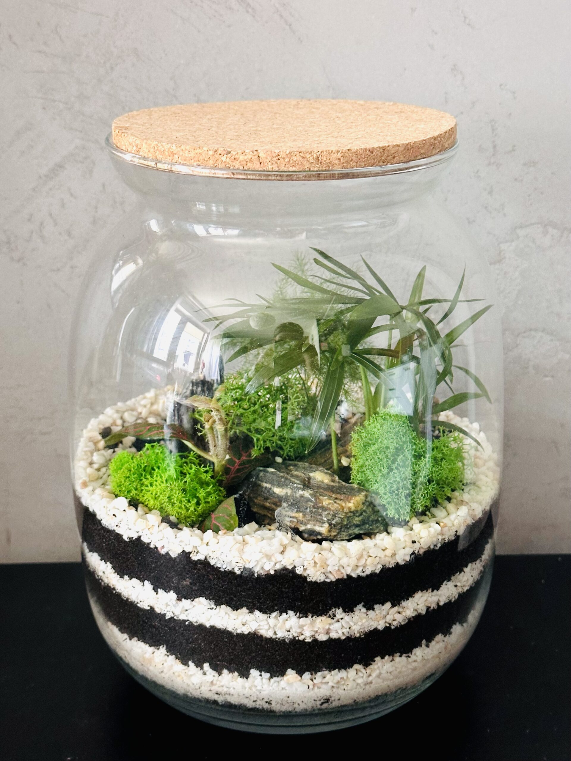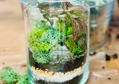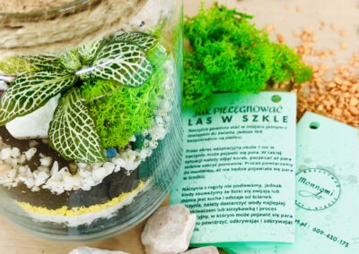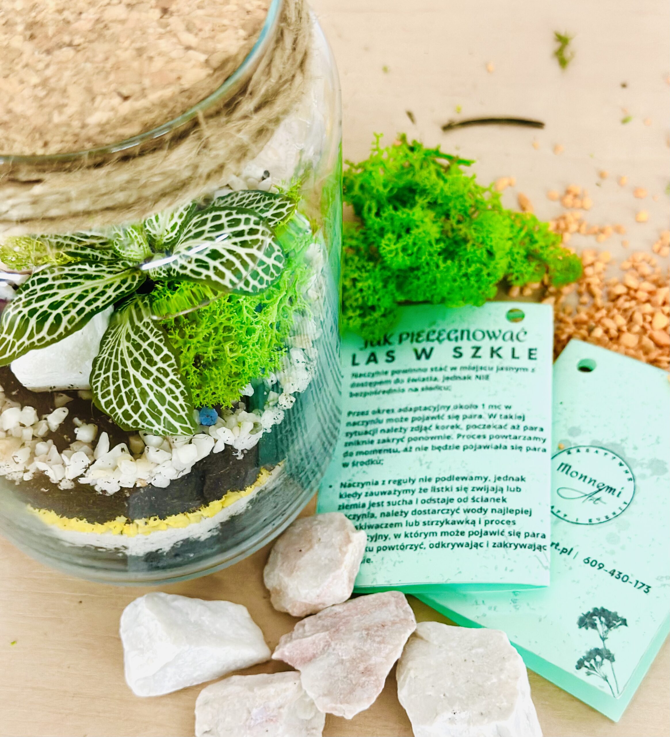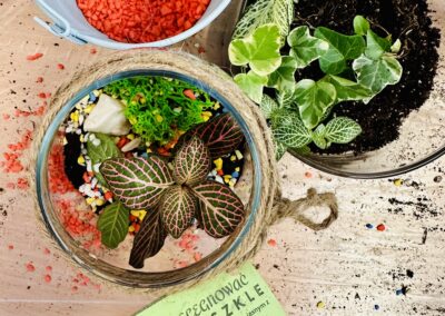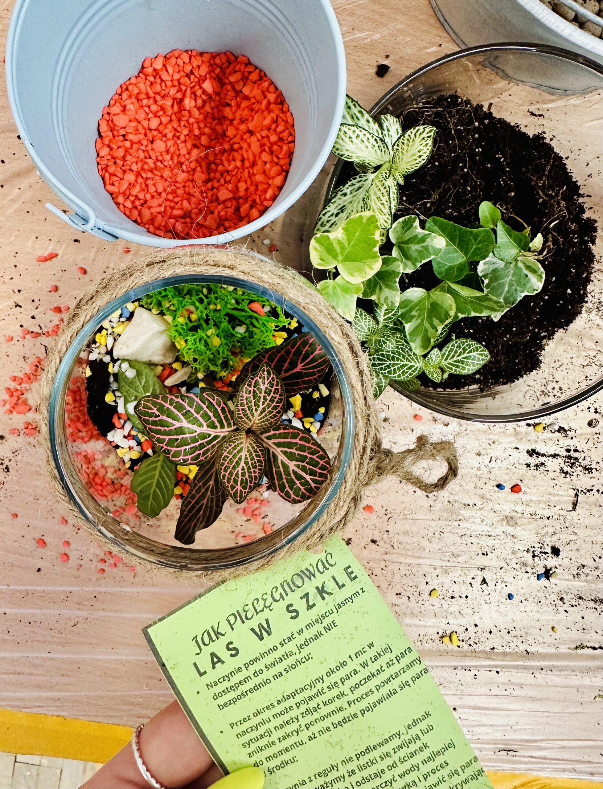 • Każdy uczestnik samodzielnie tworzy zamknięty Las w Szkle 1 L lub 3 L (wybór zależy od organizatora)