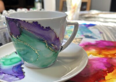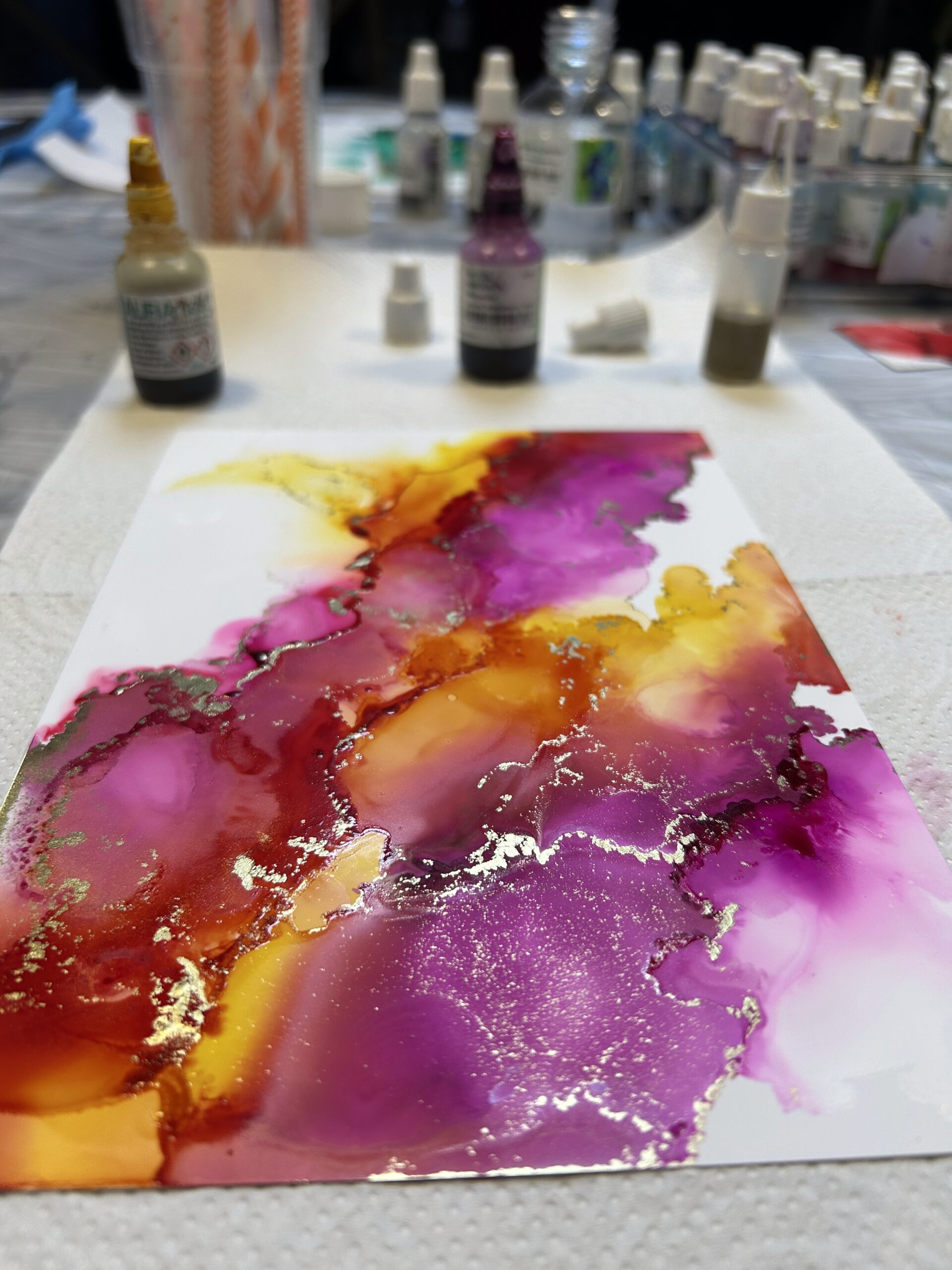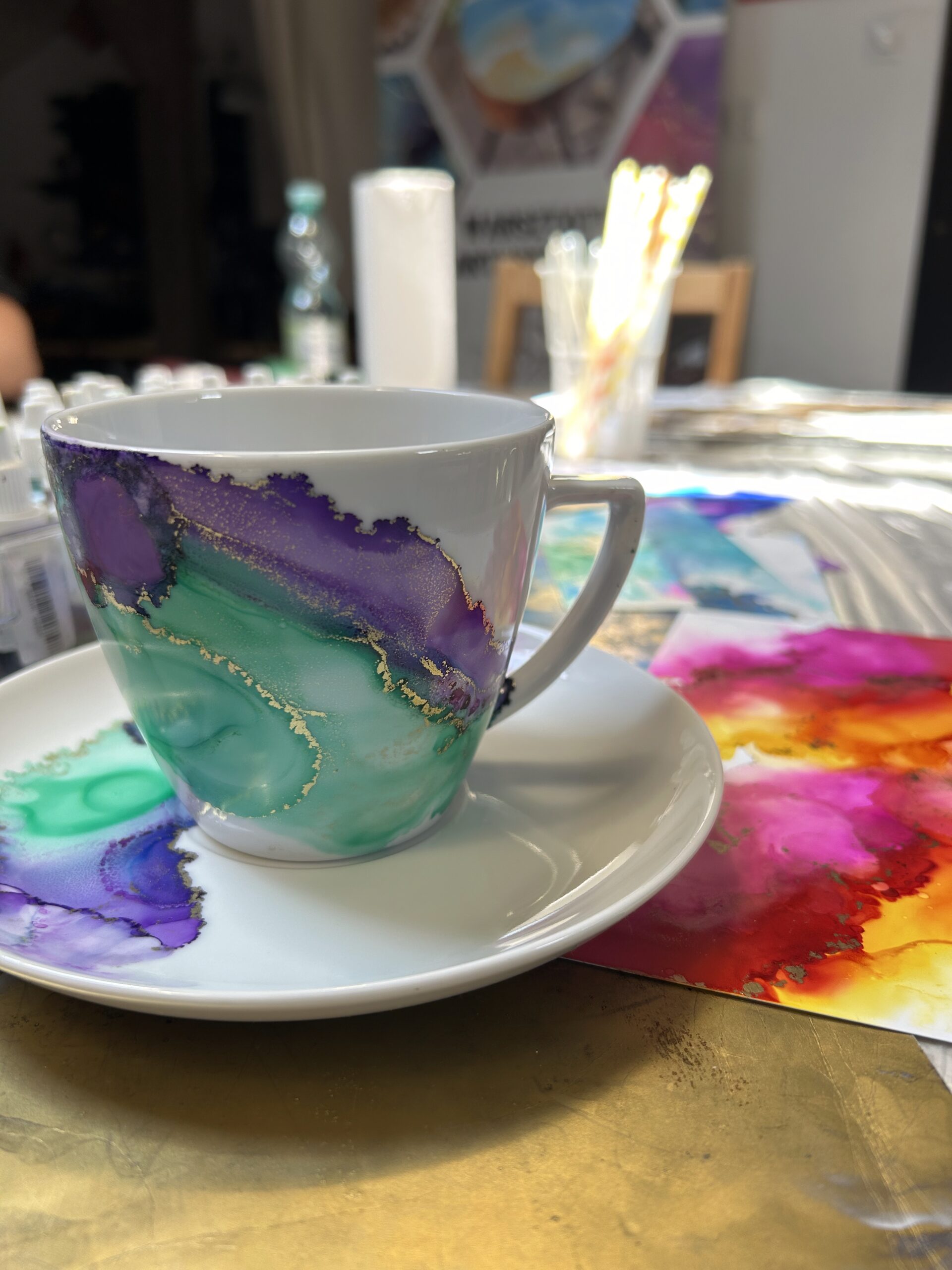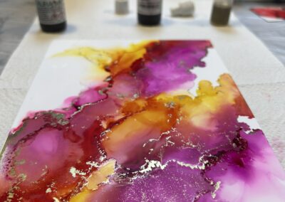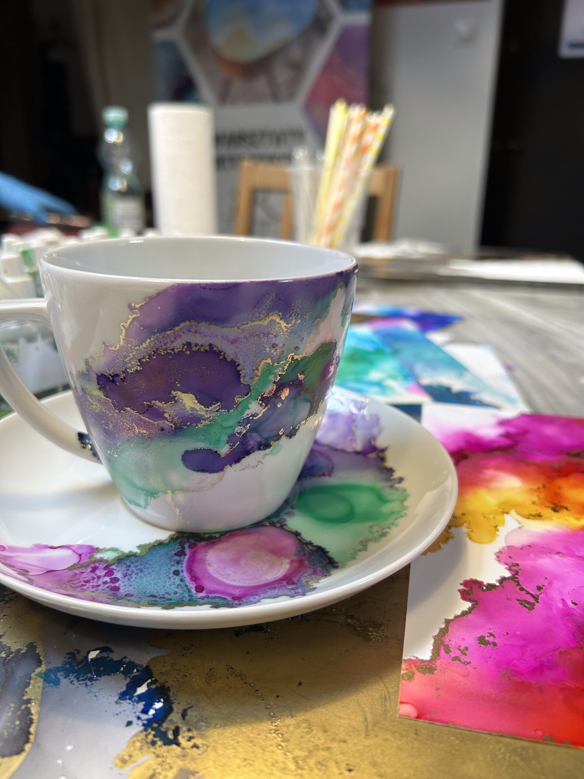 Malowanie tuszami alkoholowymi to świetna zabawa dla małych jak i dużych uczestników warsztatów. Kolorowe barwy mieszają i przenikają się na wzajem, tworząc piękne marmurkowe połączenia niczym tiulowe welony